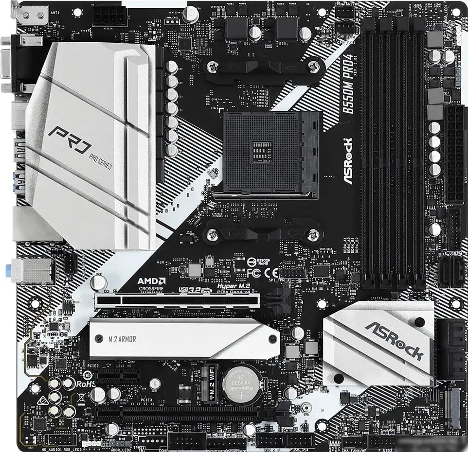 mATX, сокет AMD AM4, чипсет AMD B550, память 4xDDR4 до 4733 МГц, слоты: 2xPCIe x16 4.0 и 3.0, 2xM.2