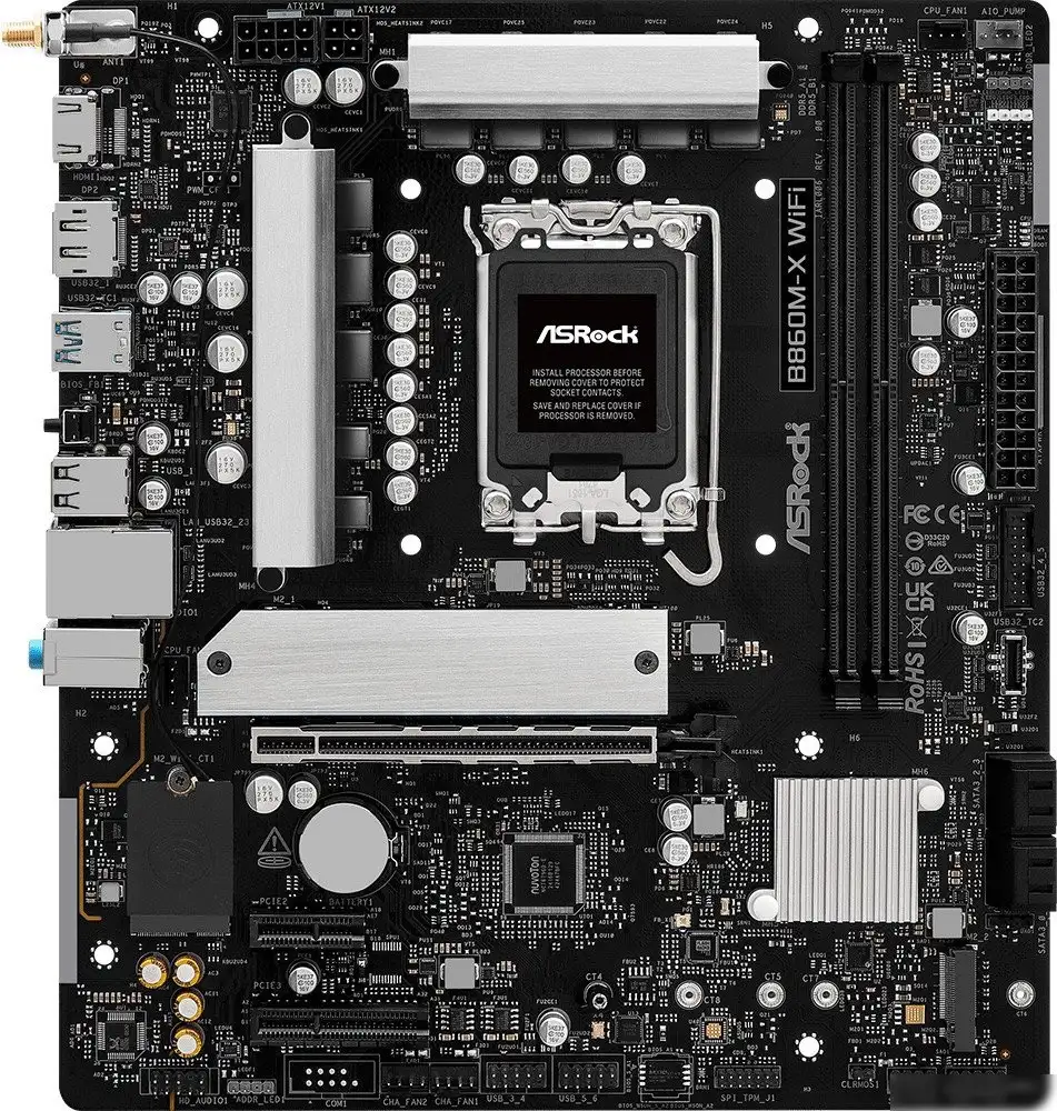 mATX, чипсет Intel B860, память 2xDDR5/DDR5 CUDIMM до 9066 МГц, слоты: 1xPCIe x16 5.0, 1xPCIe x4, 1xPCIe x1, 2xM.2, 802.11ax (Wi-Fi 6E)+Bluetooth 5.3, 7+1+1+1+1 фаз питания