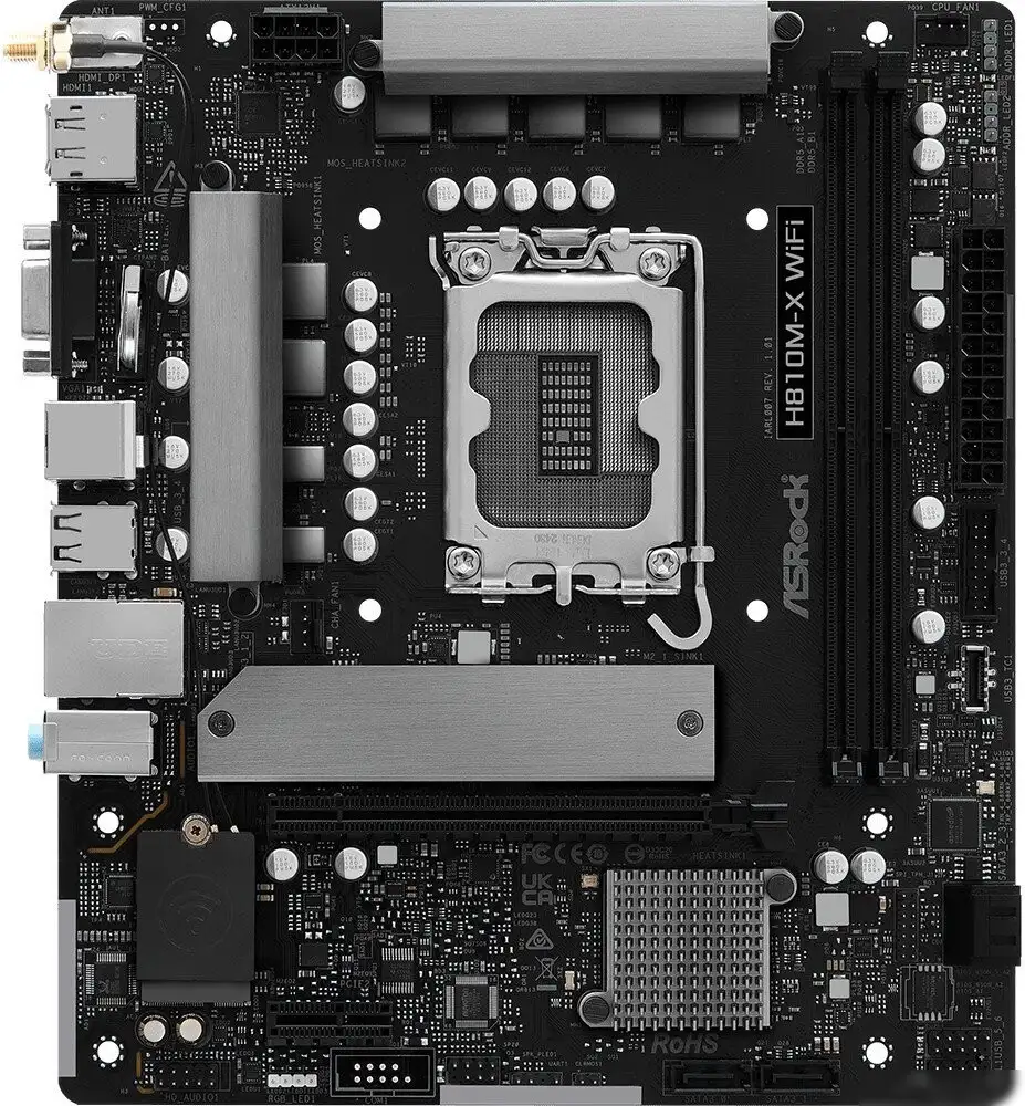 mATX, чипсет Intel H810, память 2xDDR5/DDR5 CUDIMM до 6400 МГц, слоты: 1xPCIe x16 4.0, 1xPCIe x1, 1xM.2, 802.11ac (Wi-Fi 5)+Bluetooth 5.0, 6+1+1+1+1 фаз питания