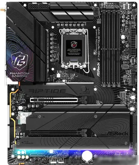 Материнская плата ASRock Z790 Riptide WiFi создана для поддержки процессоров Intel с сокетом LGA1700 и чипсетом Intel Z790. Она оснащена четырьмя слотами DDR5 памяти, позволяющими увеличить объём до 192 ГБ и достигать скорости до 8000 МГц при разгоне, что обеспечивает быструю работу системы. Модель поддерживает последние интерфейсы PCI Express 5.0, а также имеет пять слотов M.2 для высокоскоростных SSD с режимами PCIe Gen5 и Gen4, что ускоряет передачу данных и загружает системы мгновенно. В плате есть встроенный модуль Wi-Fi 7 и Bluetooth 5.4, обеспечивающие стабильное подключение без проводов, а также 2.5 Гбит Ethernet для быстрой проводной связи. Устройство поддерживает множество разъемов USB, включая USB 3.2 Gen2x2 с пропускной способностью до 20 Гбит/с, что удобно для подключения периферии. Встроенная звуковая схема Realtek ALC1220 даёт качественный звук для игр и мультимедиа. Кроме того, плата оборудована подсветкой ARGB и RGB, что позволяет украсить компьютер по своему вкусу. Она также оснащена разъемами для системы охлаждения и подсветки, что делает её удобной в использовании и настройке.