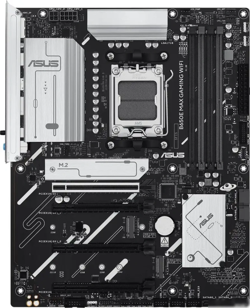 ATX, чипсет AMD B650E, память 4xDDR5 до 8000 МГц, слоты: 4xPCIe x16 5.0, 3xM.2, 802.11ax (Wi-Fi 6E)+Bluetooth 5.3