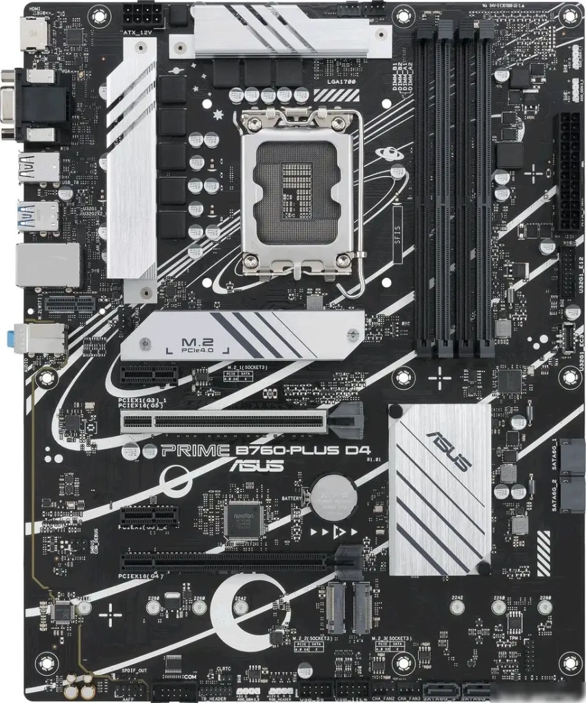 Материнская плата ASUS Prime B760-Plus D4 поддерживает процессоры Intel 12-го и 13-го поколения и использует сокет LGA1700. Она имеет форм-фактор ATX и оснащена четырьмя слотами для DDR4-памяти, позволяющими установить до 128 ГБ оперативной памяти с частотой до 5066 МГц. Благодаря поддержке PCI Express 5.0, плата обеспечивает быстрый обмен данными с видеокартами и компонентами расширения. Устройства хранения подключаются через три M.2 слота с поддержкой PCIe 4.0 и четыре SATA 3.0 порта. Для сетевых подключений есть гигабитный Ethernet и слот для модуля Wi-Fi. Встроенная звуковая схема обеспечивает качественный звук, а на задней панели есть разнообразные порты USB, HDMI и DisplayPort для подключения дисплеев. Плата оснащена разъемами для вентиляторов и подсветки, что удобно для охлаждения и оформления системы. Она поставляется с комплектом кабелей, рамкой портов и винтами для установки.