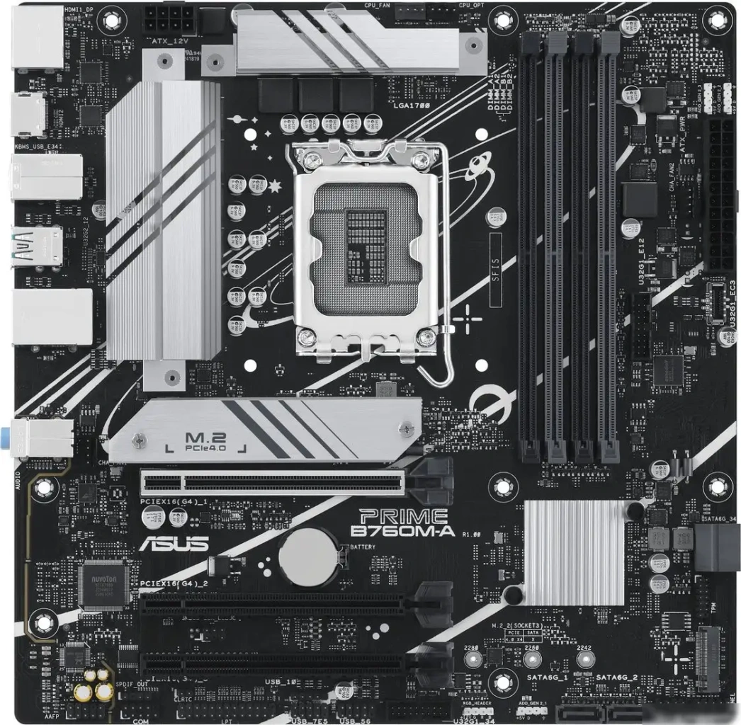 Материнская плата ASUS Prime B760M-A-CSM подойдет для сборки ПК с процессорами Intel 12-го и 13-го поколения благодаря поддержке Socket LGA1700 и чипсету Intel B760. Она оснащена четырьмя слотами DDR5, что позволяет установить до 128 ГБ оперативной памяти с частотой до 6600 МГц и поддержкой Intel XMP. На плате есть два слота M.2 с поддержкой PCIe 4.0, что ускоряет работу SSD, и четыре порта SATA 3.0 для дополнительных жестких дисков. Для отображения графики предусмотрены выходы HDMI и DisplayPort, что делает ее хорошим выбором для мультимедийных задач. Встроенный сетевой порт Ethernet обеспечивает стабильное подключение со скоростью 2,5 Гбит/с. Плату дополняют разъемы USB 3.2 Gen2 Type-C и Type-A, а также разъемы для вентиляторов и подсветки. Она также имеет возможность установки дополнительных вентиляторов и подсветки, что помогает управлять охлаждением и внешним видом компьютера.