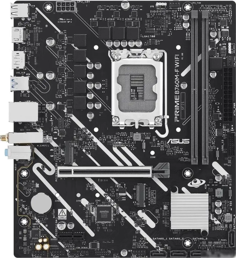 ASUS Prime B760M-F WiFi — это надежная материнская плата для сборки домашнего или офиса ПК. Она поддерживает современные процессоры Intel и обеспечивает стабильную работу системы. Благодаря встроенному WiFi-модулю, вы легко подключаетесь к интернету без дополнительных кабелей. Плата имеет слот для оперативной памяти DDR4 с высокой скоростью, что улучшает работу приложений и игр. Разъемы M.2 позволяют установить быстрые SSD для ускорения загрузки системы и работы приложений. Она оснащена несколькими портами USB для подключения периферии, а также разъёмами для видеовыходов для подключения мониторов. Плата обеспечивает хорошую систему охлаждения благодаря вентилям и элементам, которые быстро отводят тепло. Она имеет надежную конструкцию и защиту от перенапряжений, что увеличивает срок службы компонентов. Также есть встроенный аудиокодек для качественного звука при просмотре фильмов или игре.