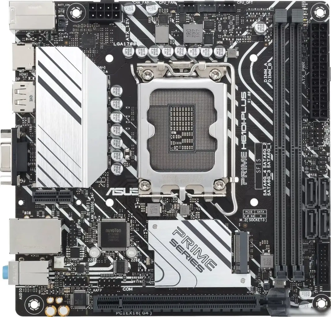 Материнская плата ASUS Prime H610I-PLUS-CSM создана для поддержки процессоров Intel 12-го и 13-го поколений с сокетом LGA1700. Она обеспечивает работу с DDR5 памятью до 96 ГБ, достигая частоты 5600 МГц, что помогает ускорить работу системы. В плате есть слот M.2 для быстрого SSD, а также 4 SATA порта для дополнительных накопителей. Плата оснащена одним слотом PCIe 4.0 x16, что позволяет подключать современные видеокарты и расширять графическую производительность. Она поддерживает встроенную графику Intel и имеет встроенный сетевой порт Ethernet для быстрой сети. В задней панели есть порты USB 3.2, USB 2.0, HDMI и DisplayPort, что даёт возможность подключать различные устройства и дисплеи. Для охлаждения есть разъемы для вентилятора CPU и корпуса, а также возможность подключения вентиляторов с разъемами 4-пин. Плата не имеет подсветки и Wi-Fi модуля, но она сохраняет все основные функции для стабильной работы ПК.