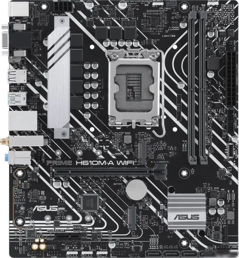 mATX, сокет Intel LGA1700, чипсет Intel H610, память 2xDDR5 до 5600 МГц, слоты: 1xPCIe x16 4.0, 1xPCIe x1, 2xM.2, 802.11ac (Wi-Fi 5)+Bluetooth 5.0