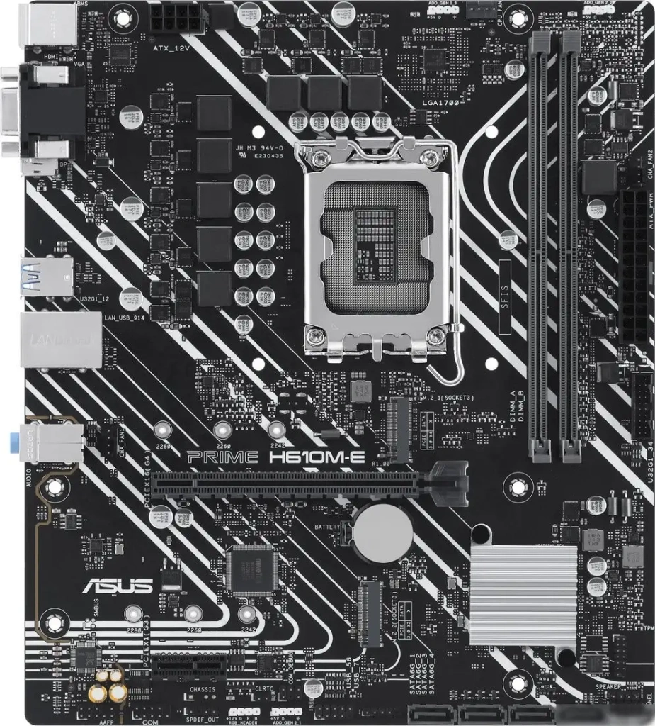 mATX, сокет Intel LGA1700, чипсет Intel H610, память 2xDDR5 до 5600 МГц, слоты: 1xPCIe x16 4.0, 1xPCIe x1, 2xM.2