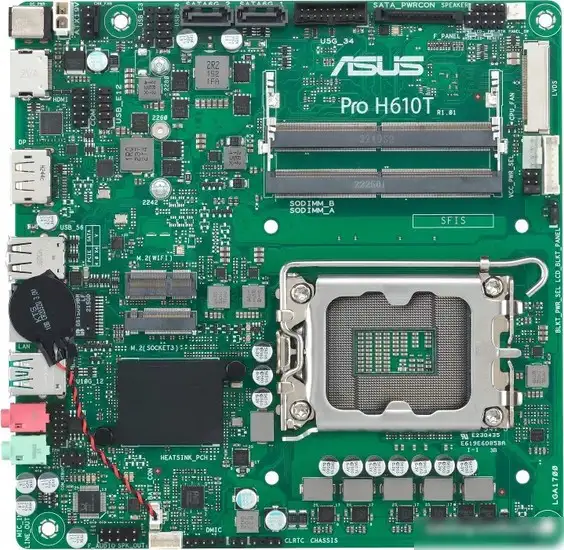 Mini-ITX, сокет Intel LGA1700, чипсет Intel H610, память 2xDDR5 SO-DIMM до 5600 МГц, слоты:, 1xM.2