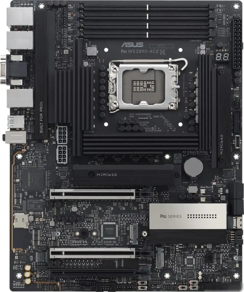 Материнская плата ASUS Pro WS Z890-ACE SE предназначена для работы с процессорами Intel Core Ultra на сокете LGA1851 и поддерживает технологии DDR5 памяти до 256 ГБ с частотой до 9 066 МГц. Она оснащена 4 слота M.2, позволяющими быстро подключать SSD-накопители через интерфейсы PCIe 5.0 и PCIe 4.0, а также 8 портов SATA для жестких дисков и SSD. Плата использует чипсет Intel Z890 и имеет поддержку современных интерфейсов, таких как USB 3.2 Gen 2x2, Thunderbolt 4 и Ethernet с тремя портами — 1 Гбит/с, 2.5 Гбит/с и 10 Гбит/с. Для звука предусмотрена качественная схема Realtek ALC1220P с поддержкой 7.1 каналов, что улучшает качество аудио. Ее форм-фактор ATX позволяет установить плату в стандартный корпус, а наличие нескольких разъемов для вентиляторов и разъемов питания обеспечивает хорошую систему охлаждения и стабильную работу. В плате есть HDMI 2.1 для вывода изображения, а также внутренняя поддержка USB-C и Thunderbolt 5 для быстрого подключения периферии. Эта плата подходит как для профессиональных задач, так и для высокопроизводительных систем.