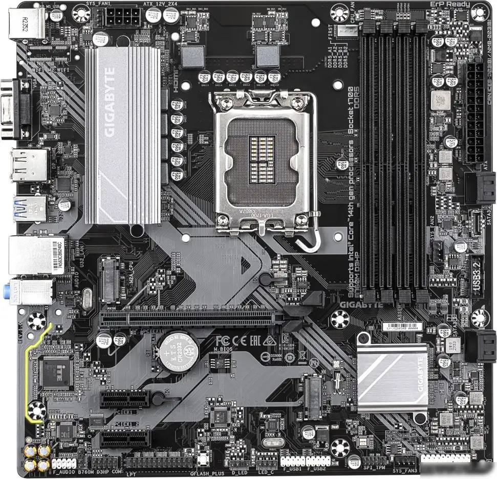 Материнская плата Gigabyte B760M D3HP предназначена для сборки компьютеров на базе процессоров Intel с разными поколениями, начиная с 12-го. Она поддерживает память DDR5 с частотой до 5600 МГц, имеет четыре слота для RAM и может вместить до 256 ГБ. В плате есть один разъем PCIe 4.0 x16 и два слота M.2 для быстрого хранения данных, а также четыре порта SATA для жестких и твердотельных дисков. Для подключения устройств есть множество USB-портов, включая USB 3.2 Gen 1 и Gen 2, а также разъем HDMI и DisplayPort для вывода изображения. Также плата поддерживает функции RAID и обеспечивает стабильное электропитание благодаря четырем фазам питания.