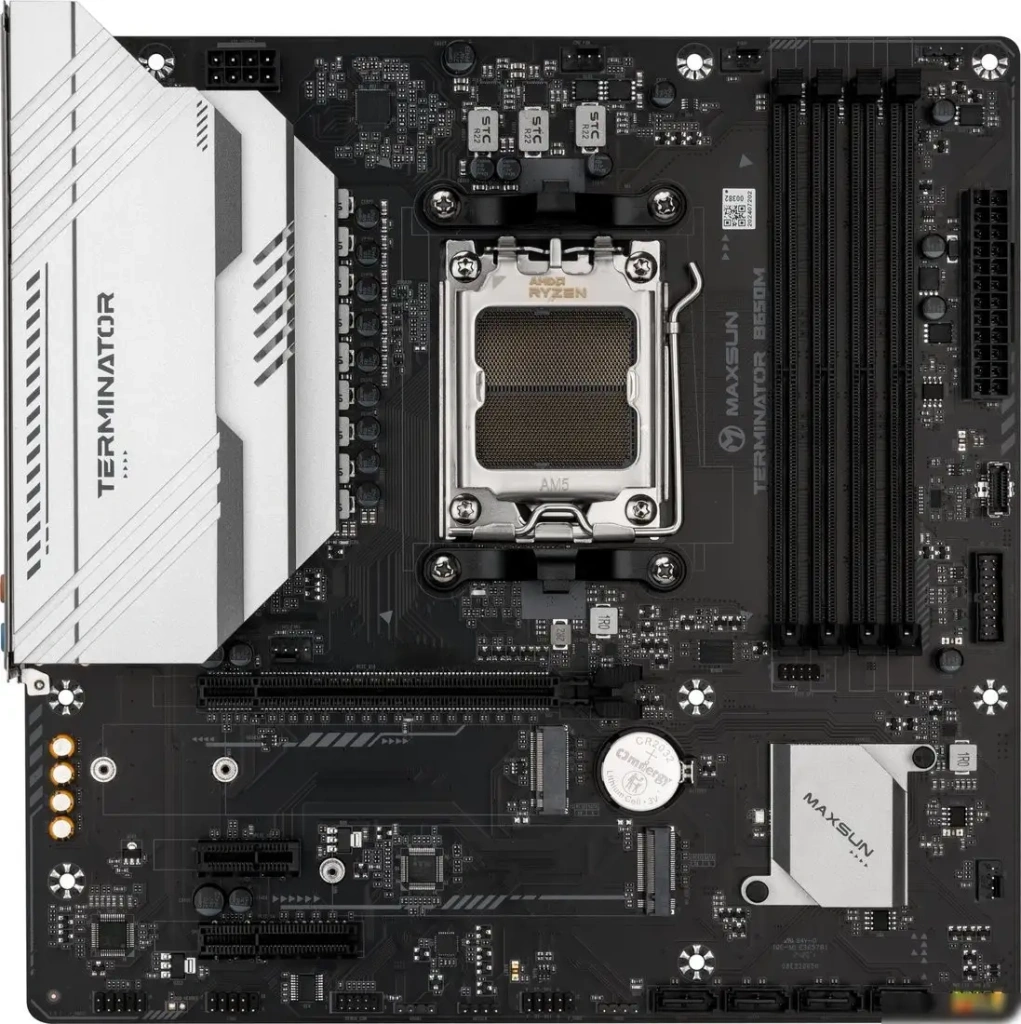 Материнская плата Maxsun Terminator B650M подходит для процессоров AMD поколений 7000, 8000 и 9000 и использует сокет AM5. Она поддерживает DDR5 память с двумяканальным режимом и четырьмя слотами, максимально объемом до 192 ГБ и частотой до 5200 МГц. В плате есть один слот PCIe 5.0 x16 для видеокарт и два M.2 для быстрых SSD, а также четыре порта SATA для традиционных накопителей. Она соединяется с сетью через гигабитный Ethernet порт, поддерживает встроенную графику и имеет качественный аудиоконвертер Realtek ALC897. У платы есть внутренние разъемы для вентиляторов, охлаждения и подсветки, что обеспечивает хорошую вентиляцию и настройку системы. Габариты 245х245 мм позволяют установить ее в стандартный ATX корпус. Без подсветки и дополнительных интерфейсов она хорошо подходит для современных систем с высокой производительностью.