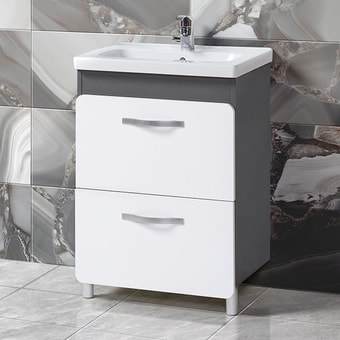 Тумба под умывальник Акваль Сеул 62 — это удобная мебель для ванной комнаты. Она сделана из прочных материалов: ЛДСП, МДФ и ДВП. Размеры тумбы: ширина 60 см и глубина 41,6 см, высота 82 см, вес 23,4 кг. Тумба окрашена в белый или серый цвет, что подходит к разной сантехнике. Она устанавливается на пол и отлично смотрится в любой ванной. В комплект не входит умывальник, а корзина для белья и угловая конструкция отсутствуют.