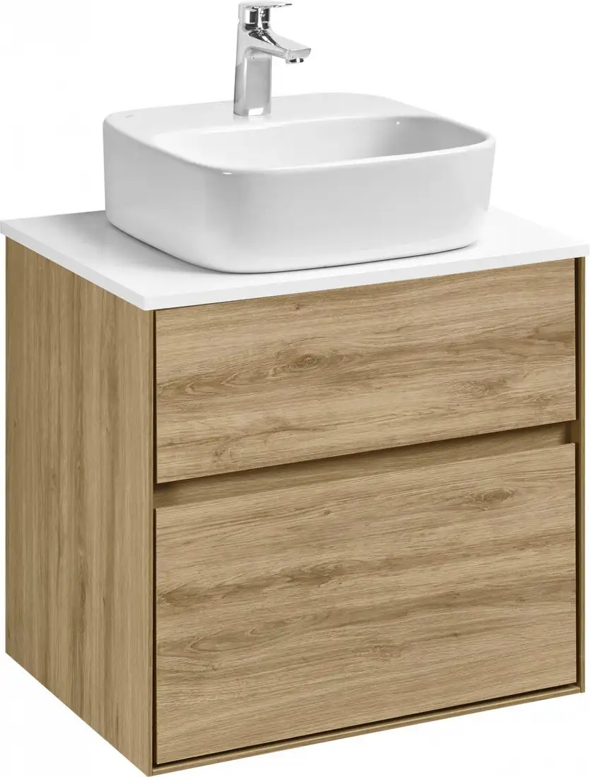 Тумба под умывальник Либерти 60 от Акватон — это практичный и стильный вариант для ванной комнаты. Она выполнена из влагостойкого ЛДСП с имитацией дерева, что делает её устойчивой к влажности. Тумба оснащена двумя ящиками с механизмом Push-to-Open, благодаря которому их легко открывать и закрывать одним нажатием. Размер ящиков позволяет удобно организовать хранение вещей. Тумба подходит к различным раковинам, например, мебельной раковине Элина или накладным моделям Roca Mila и Santek Одри Soft. Она отлично сочетает простоту, функциональность и современный дизайн.