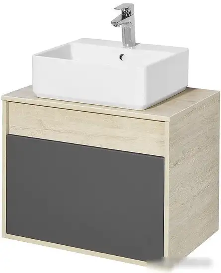 Тумба под умывальник Лофт Урбан 65 отлично подходит для современной ванной комнаты. Она состоит из двух ящиков с полным выдвижением, в которых удобно хранить разные вещи — от небольших аксессуаров до более крупных предметов. Верхний ящик оборудован внутренней организацией для аккуратного хранения, а функция push-to-open делает открывание легким и удобным. Влагостойкий корпус из ламинированной ДСП в тире дуб орегон красиво сочетается с фасадами из МДФ антрацит с мягким наощущением. Тумба имеет современный дизайн, может крепиться как с помощью металлических опор, так и без них, что позволяет выбрать удобный вариант установки.