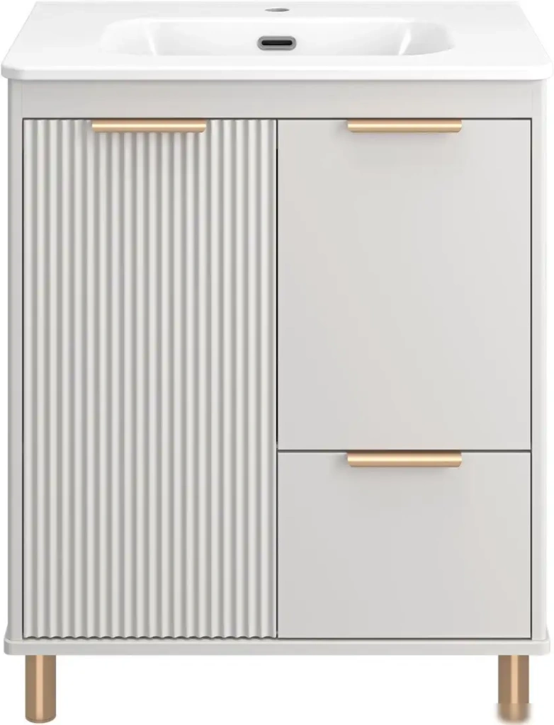 Тумба под умывальник Brevita Risacca Crema 70 RIS-06070-0342 помогает организовать пространство в ванной. Она выполнена из МДФ с мягким серым кашемировым цветом и имеет стильный золотистый акцент. Размеры тумбы — ширина 70,4 см, глубина 46 см, высота 73,8 см, весится 33 кг. Тумба предназначена для установки на пол и подходит под умывальник шириной 70 см. Благодаря его угловой конструкции, она удобно вписывается в небольшое пространство. В комплекте умывальник отсутствует, что позволяет выбрать модель по желанию. Комната может оставаться аккуратной благодаря простым в использовании водоотводам и надежной конструкции. Эта тумба не оснащена встроенной подсветкой или корзиной для белья, что делает её максимально функциональной и удобной.
