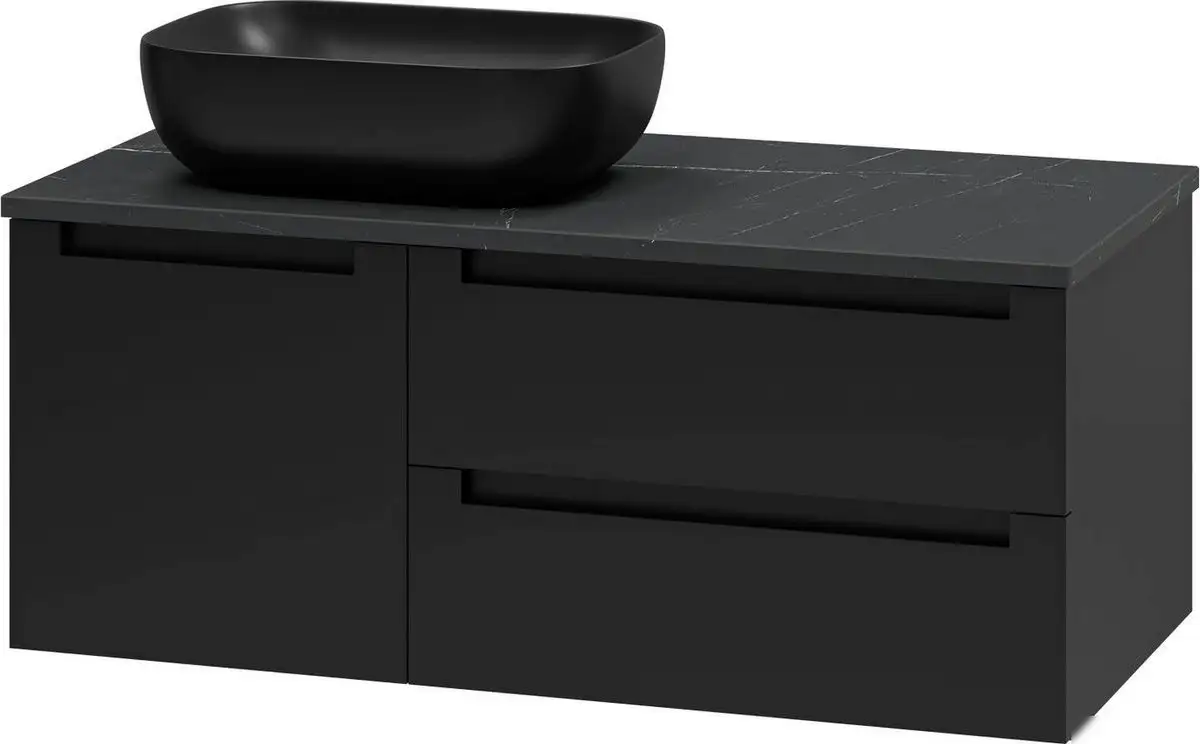 Тумба под умывальник Brevita Cargo 100 предлагает удобное хранение для вашей ванной комнаты благодаря своей продуманной конструкции. Она выполнена из ЛДСП и МДФ, что обеспечивает долговечность и устойчивость к влаге. Тумба устанавливается как навесная, что облегчает уборку пространства под ней. Размеры: ширина 98.9 см, глубина 48.6 см, высота 39.5 см позволяют разместить в большинстве стандартных ванных комнат. Чёрный цвет придаёт современной эстетики интерьеру. Тумба не имеет встроенной подсветки и угловую конструкцию, поэтому подходит для простых в оформлении помещений. Две выдвижных секции оснащены удобными доводчиками, что облегчает доступ и использование. Конструкция способствует организации и хранению бытовых принадлежностей. Размеры и дизайн делают её универсальным выбором для современного интерьера ванной.