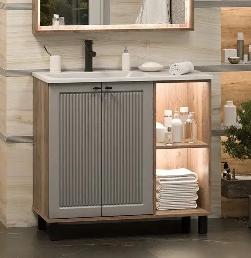Тумба под умывальник Brevita Lumus 90 сочетает стильный дизайн и практичность для вашей ванной комнаты. Она выполнена из прочных материалов — ЛДСП и МДФ, выдерживает ежедневную эксплуатацию. Размеры позволяют установить её под умывальник шириной 90 см, она занимает мало места благодаря компактной глубине 44,4 см. Тумба устанавливается на пол, что обеспечивает устойчивость и легкую установку. Внутри есть встроенные доводчики для плавного закрытия и органайзер для разделения пространства. Конструкция выполнена в современных цветах: сером и дуб темный, что гармонично дополнит любой интерьер. Встроенная подсветка улучшает освещение и делает использование удобнее. Благодаря функциональности и продуманному дизайну, эта модель повысит комфорт и порядок в ванной. Весит тумба 31 кг, что обеспечивает надежность и прочность конструкции.