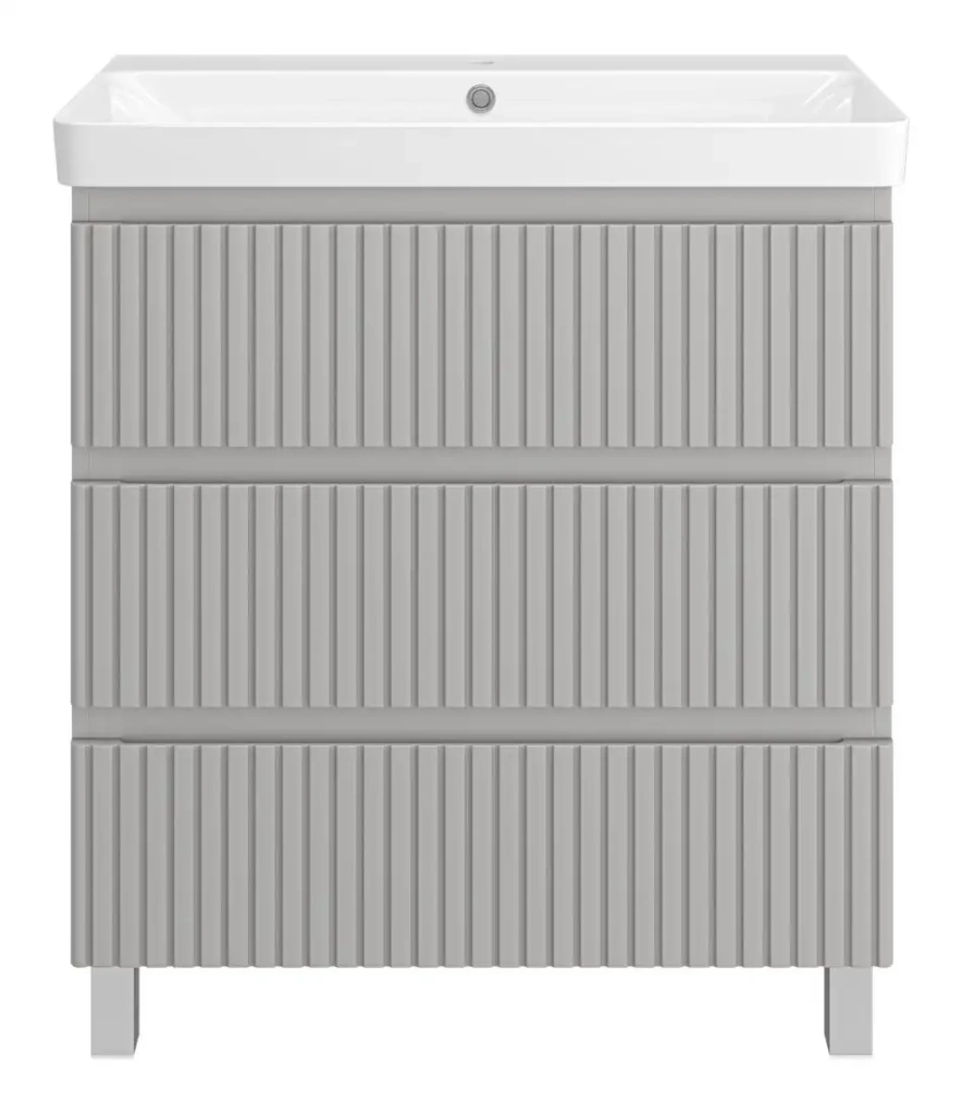 Тумба под умывальник Brevita Victory 80 сочетает в себе практичность и стильный дизайн. Она изготовлена из прочных материалов — ЛДСП и МДФ, что обеспечивает долговечность и надежность. Тумба устанавливается прямо на пол, ее ширина составляет 75 см, что подходит для умывальника шириной 80 см. Глубина модели — 45,4 см, а высота — 83 см. Тумба имеет серый цвет, который легко сочетается с разными интерьерами. Конструкция проста в использовании и позволяет удобно хранить необходимые вещи. Благодаря надежной фурнитуре, она долго сохраняет функциональность. Вес изделия — 37,5 кг, что говорит о прочности и устойчивости. Дополнительных функций, таких как подсветка или угловая конструкция, в этой модели нет.