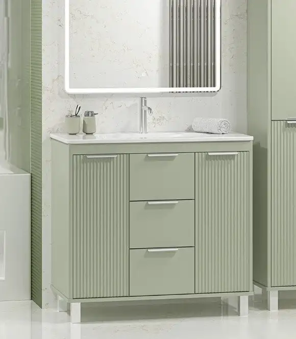 Тумба с умывальником Brevita Risacca в фисташковом цвете сочетает стильный дизайн и практичность. Она выполнена из МДФ и керамики, что обеспечивает долговечность и легкость ухода. Тумба устанавливается на пол, занимает ширину 91 см, а умывальник подходит для отверстий шириной 90 см. В конструкции отсутствует угловая форма, что делает её удобной для использования в обычной ванной комнате. В комплект входит умывальник, что упрощает установку. Тумба оснащена доводчиками для плавного закрытия дверок, а также имеет органайзер для эффективного использования внутреннего пространства. Высокая устойчивость достигается за счет прочных материалов, а вместительная корзина для белья помогает сохранить порядок. Габариты позволяют разместить её даже в небольших помещениях, а вес в 67 кг устойчиво удерживает всю конструкцию.
