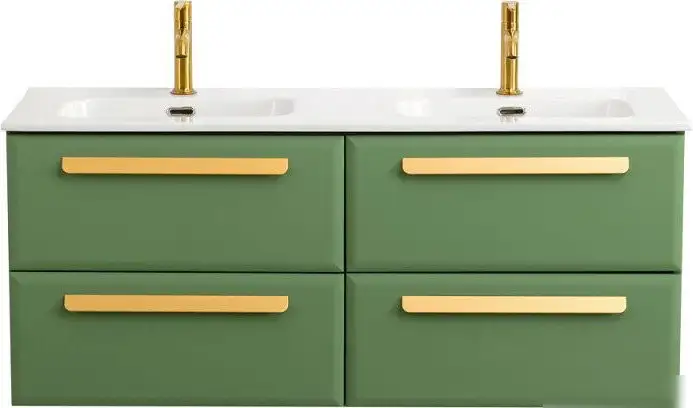 Тумба под умывальник Cezares ECO-CER-N-1200-4C-SO-2-PS-P выполнена из МДФ и установлена на подвесе, что делает её легко монтируемой и удобной в использовании. Ее ширина составляет 121 см, что позволяет разместить необходимые вещи вокруг умывальника. Тумба окрашена в красивый матовый зеленый цвет с золотыми акцентами, создавая современный и стильный вид. Благодаря угловой конструкции, она эффективно использует пространство в ванной комнате. В конструкции есть полезные доводчики, которые мягко закрывают дверцы, и органайзер для хранения мелочей. Размеры тумбы: глубина 45 см и высота 50 см, что подходит для большинства стандартных помещений. В комплект умывальник не входит, что дает возможность подобрать его по своему вкусу. Тумба не имеет встроенной подсветки или встроенного зеркала, но она легко сочетается с разной сантехникой и аксессуарами. Благодаря функциональности y присутствию доводчиков и органайзера, мебель обеспечивает комфорт и порядок в ванной комнате.