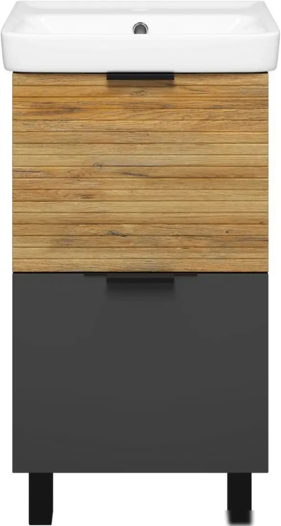 Тумба под умывальник Misty Форест 50 создаст аккуратный и практичный вид в вашей ванной. Она выполнена из прочных материалов — ЛДСП и МДФ, что обеспечивает долговечность и лёгкий уход. Тумба устанавливается на пол и подходит для умывальника шириной 50 см, а её ширина составляет 44,4 см. Конструкция не имеет углов и встроенной подсветки, что делает её простой и удобной в использовании. Размеры тумбы: глубина 34,3 см и высота 81,6 см, весит она 15 кг. Черный цвет с деревянным оттенком добавит в интерьер стильный акцент. Удобные доводчики обеспечивают мягкое закрытие дверец и защиту от случайных повреждений. Тумба отлично подходит для хранения сантехники и косметики, делая вашу ванную более организованной.