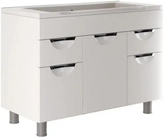 Тумба под умывальник Mixline Этьен-100 выполнена из МДФ, что обеспечивает долговечность и легкую очистку. Она устанавливается на пол, занимает ширину 98,3 см, идеально подходит для умывальника шириной 100 см. Тумба имеет угловую конструкцию и компактную глубину 43,6 см, что позволяет эффективно использовать пространство в ванной. Высота тумбы составляет 79 см, а вес — около 40,4 кг, что облегчает её установку и переноску. Тумба окрашена в белый цвет с хромированными ручками, что придает ей современный и свежий вид. Внутри есть место для хранения различных предметов и аксессуаров. Тумба оснащена доводчиками для мягкого закрытия дверцы, что удобно при использовании. Размеры и классический дизайн делают её универсальной для большинства современных интерьеров. Конструкция не предусматривает встроенной подсветки или угловых элементов, что упрощает её использование. Эта тумба сочетает стиль и функциональность, делая вашу ванную комнату аккуратной и удобной.