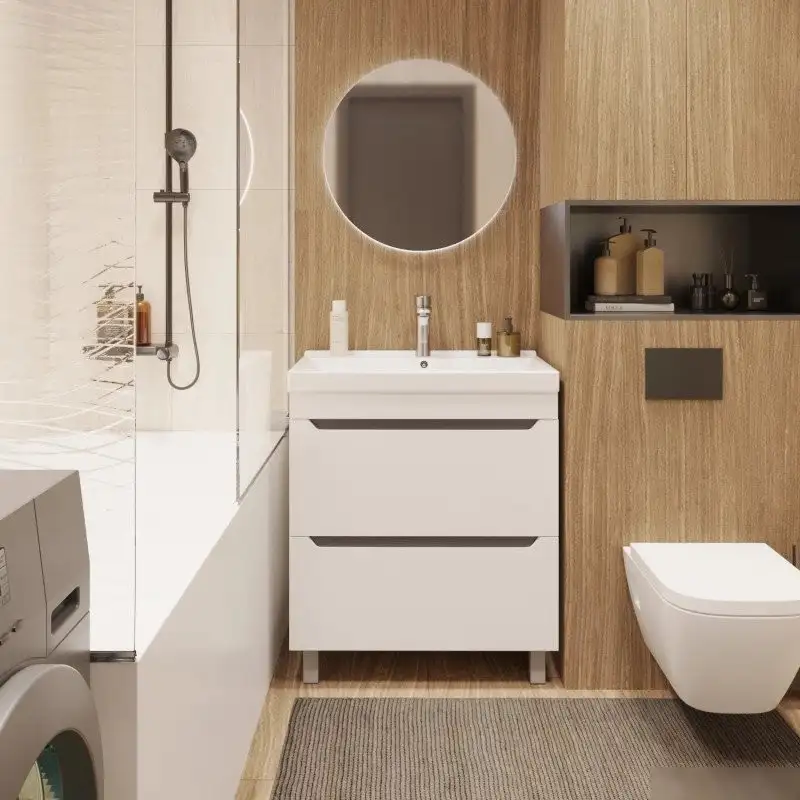 Тумба под умывальник Mixline Лайн-70 изготовлена из ЛДСП и МДФ и предназначена для умывальника шириной около 70 см. Её конструкция проста — она устанавливается на пол и обеспечивает устойчивость. Тумба имеет комфортные размеры: ширину 69,4 см, глубину 44,1 см и высоту 70,7 см, при этом весит 27 кг. Поверхность белая, которая легко сочетается с любым интерьером в ванной. Тумба предполагает сборку, а также встроенный органайзер, который помогает держать вещи в порядке. Она не оснащена встроенной подсветкой или угловой конструкцией, что делает её удобной и практичной. Тумба полностью собрана, готова к использованию сразу после монтажа. Такой дизайн позволяет максимально эффективно использовать пространство под умывальником и хранить все необходимые мелочи. Эту мебель легко обслуживать и она прослужит долго.