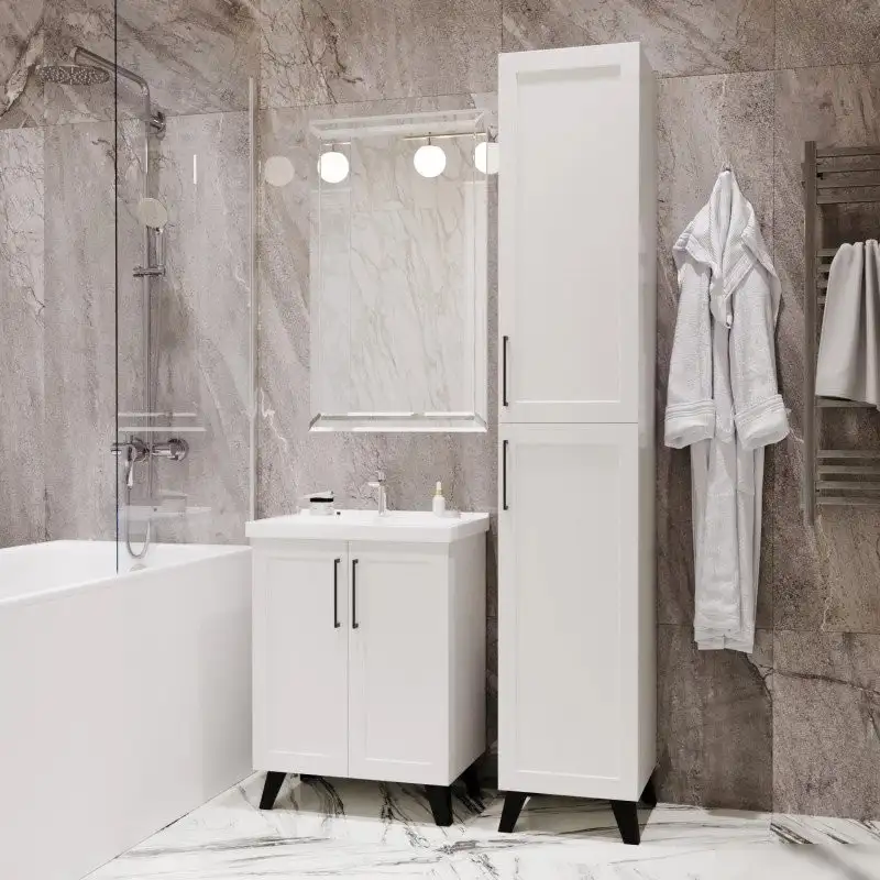 Тумба под умывальник Mixline Риф-60 идеально подходит для установки под умывальники шириной 60 см. Она выполнена из прочных материалов — ЛДСП и МДФ, что обеспечивает долговечность. Тумба устанавливается прямо на пол и не занимает много места, глубиной всего 38,3 см. Ее корпус имеет современный дизайн и доступен в белом или черном цвете, чтобы гармонично вписаться в любой интерьер. Внутри есть удобный органайзер для хранения туалетных принадлежностей и других мелочей. Тумба оснащена качественными доводчиками, которые позволяют легко и бесшумно закрывать дверки. Размеры: ширина 57 см, высота 69 см, вес 17,2 кг. Простая сборка позволяет быстро подготовить изделие к использованию. Эту тумбу легко сочетать с разными стилями ванной комнаты и она прослужит долго благодаря прочной конструкции.