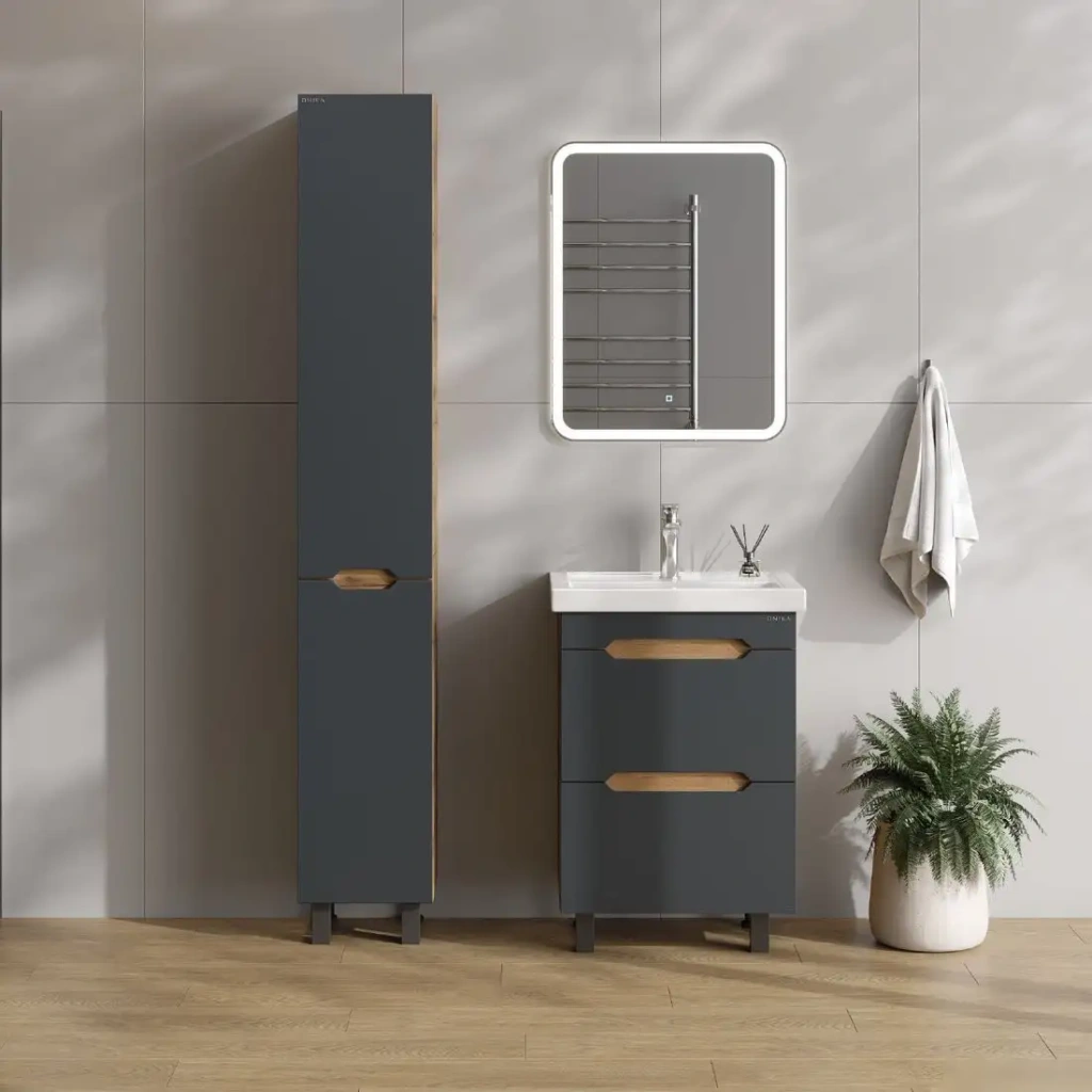 Тумба под умывальник Onika Айленд 50 выполнена из ЛДСП и МДФ, что обеспечивает прочность и долговечность. Она устанавливается прямо на пол, зная свои размеры: ширина 48 см, глубина 39,6 см и высота 66 см, подходящая для умывальника шириной 50 см. Тумба оборудована выдвижными ящиками с доводчиками, что облегчает использование и поддержание порядка. Ее темно-серый цвет графит отлично сочетается с современным интерьером. Конструкция тумбы не включает угловых элементов и встроенную подсветку, но обеспечивает стабильность и надежность. Вес товара 18,6 кг делает его легко переносимым. В собранном виде она занимает минимум места, но максимально функциональна. Тумба подойдет для тех, кто ищет практичное решение для ванной комнаты.