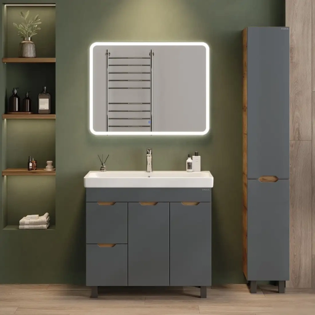 Тумба под умывальник Onika Айленд 90 создана для удобства в ванной комнате. Она выполнена из ЛДСП и МДФ, обеспечивает прочность и долговечность. Тумба устанавливается на пол и подходит для умывальников шириной 90 см. Внутри есть органайзер для хранения мелочей и корзина для белья, что помогает держать порядок. Глубина тумбы составляет 42,6 см, а высота — 68 см, соответственно она занимает минимум места. Темно-серый цвет и лаконичный дизайн отлично впишутся в современный интерьер. Тумба облегчит организацию пространства и обеспечит удобный доступ к предметам. Вместительный и практичный, этот элемент мебели облегчит ежедневные процедуры. Вес конструкции 32,8 кг, что обеспечивает надежность и устойчивость при использовании.