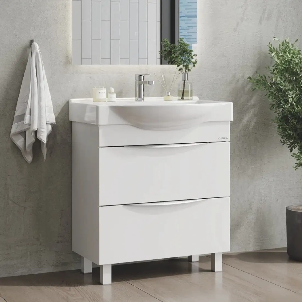 Напольная тумба под умывальник Навиа 80 предназначена для ванной комнаты и имеет ширину 77 см и глубину 35,6 см. Она выполнена из прочных материалов МДФ и ЛДСП, устойчивых к влаге, температурным колебаниям и механическим воздействиям, что обеспечивает долгий срок службы. Тумба оснащена двумя вместительными ящиками с хромированными ручками, которые помогают удобно хранить аксессуары и полотенца. Она легко устанавливается на пол и устанавливается с помощью декоративных и пластиковых ножек, что повышает стабильность и защищает от влаги. Глянцевая поверхность фасада облегчает очистку и уход, а универсальный дизайн сочетается со стилем любой ванной комнаты. Тумба подходит для установки с умывальником Santek Беверли 80, что делает её универсальным решением. Конструкция не включает встроенную подсветку, что упрощает эксплуатацию. Вся конструкция отличается сдержанной элегантностью и практичностью, сочетая функциональность с эстетикой.