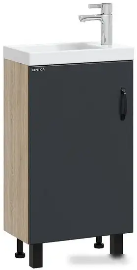 Тумба под умывальник Onika Тимбер 45 — это удобное место для хранения ваших бытовых принадлежностей. Она выполнена из прочных материалов: корпус из ЛДСП и фасад из МДФ, устойчивых к влаге и механическим повреждениям. Внутри есть просторное отделение за распашной дверцей с плавным закрыванием, что делает использование тумбы комфортным и тихим. Тумба украшена контрастными цветами: серым матовым фасадом и корпусом цвета дуба, а также имеет стильные черные металлические ручки и ножки. Установка этой мебели проста, она идет на пол, и не требует дополнительных монтажных деталей. Обратите внимание, что умывальник в комплект не входит, и эта тумба отлично подойдет для комфортной организации ванной комнаты.