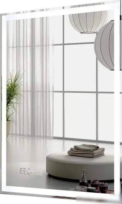 Пекам Зеркало Greta 60x80 — это удобное и практичное зеркало для ванных комнат и санузлов. Оно изготовлено из качественного стекла с LED подсветкой по периметру, которая создает приятное освещение и украшает пространство. Зеркало оснащено встроенными часами, функцией подогрева для предотвращения запотевания и сенсорным управлением, позволяющим легко менять яркость подсветки. Все электронные компоненты спрятаны внутри корпуса, который защищен от влаги и пыли по классу IP44. Светодиодная лента состоит из 600 диодов, что обеспечивает яркое и равномерное освещение.
