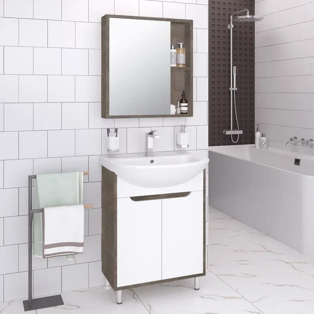 Runo Тумба с умывальником Runo Эко 60 + Уют 60 (напольная, белый/железный камень)