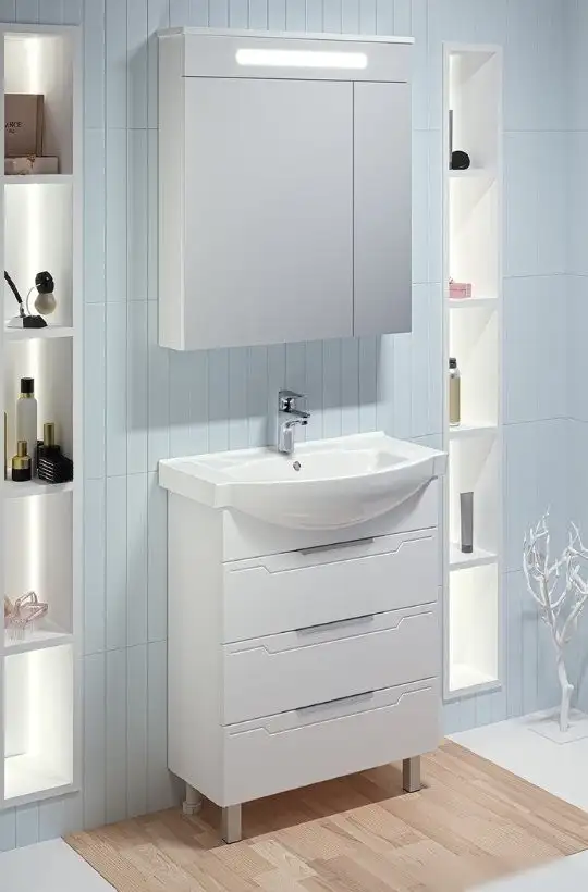Тумба с умывальником Runo Верона 65 + Элеганс 65 отлично подходит для установки в ванной комнате. Она выполнена из ЛДСП и МДФ, что обеспечивает долговечность и надежность. Тумба занимает минимум места с шириной 65 см и глубиной 44 см, при этом высота составляет 80 см. Угловая конструкция позволяет легко интегрировать её в разные планировки. В комплект входит умывальник, готовый к использованию. Тумба устанавливается на пол, обеспечивая устойчивость и простоту ухода. Материалы обеспечивают влагозащиту по степени IP20. Конструкция выполнена в белом цвете с хромированными деталями, что добавит стиль в ваш интерьер. Тумба весит 37 кг, что помогает ей оставаться устойчивой при эксплуатации. Такой комплект объединяет практичность и современный дизайн для удобной ванной комнаты.
