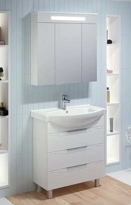 Тумба Runo Верона 75 + Элеганс 75 — это удобное решение для ванной комнаты с шириной 75 см. Она выполнена из прочных материалов: ЛДСП и МДФ, что обеспечивает долговечность. Тумба устанавливается на пол и имеет узкую, угловую конструкцию, которая подходит для небольших помещений. В комплект входит умывальник, что делает её использование проще. Тумба выдерживает влагу благодаря уровню защиты IP20 и легко сочетаться с белым цветом и хромированными деталями. Ее глубина составляет 45 см, а высота — 95.8 см. Вес конструкции — 45.6 кг. Простая и надежная, она не имеет угловых элементов, что удобно для уборки. Тумба сочетает стильный дизайн и практичность для ежедневного использования.