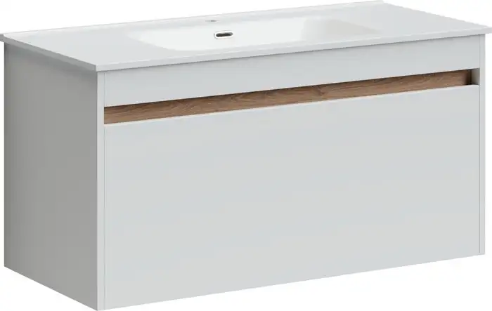 Тумба под умывальник Sancos Smart SM100W выполнена в белом глянце и имеет ширину 99 см. Она сделана из МДФ, что обеспечивает прочность и долговечность. Установка тумбы — подвесная, это удобно для уборки и сдержанности пространства. Размеры тумбы — 99 см по ширине, 45 см по глубине и 50 см по высоте, она весит около 32 кг. В конструкции отсутствует угол или встроенная корзина для белья, так что она выглядит аккуратно и лаконично. Основные функции включают устойчивую конструкцию и удобное размещение умывальника.