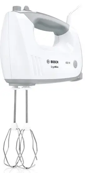 Миксер Bosch MFQ36400 — это удобный ручной прибор для взбивания и смешивания. Он работает с мощностью 450 Вт и имеет 5 скоростей, что позволяет точно подобрать нужный режим. Турборежим и импульсная функция помогают быстро и легко взбивать продукты любой густоты. В комплект входят две насадки венчик и одна для теста, которые легко отсоединяются для быстрой очистки. Корпус сделан из прочного пластика и представлен в классических бело-серых цветах. Миксер удобно держать в руке благодаря эргономичной конструкции. Он отлично подходит для приготовления пышных тортов, пюре и смесей для выпечки. Благодаря кнопке отсоединения насадок, процесс очистки становится проще. Миксер Bosch не имеет дополнительных насадок или мерных стаканов, что делает его максимально простым в использовании.