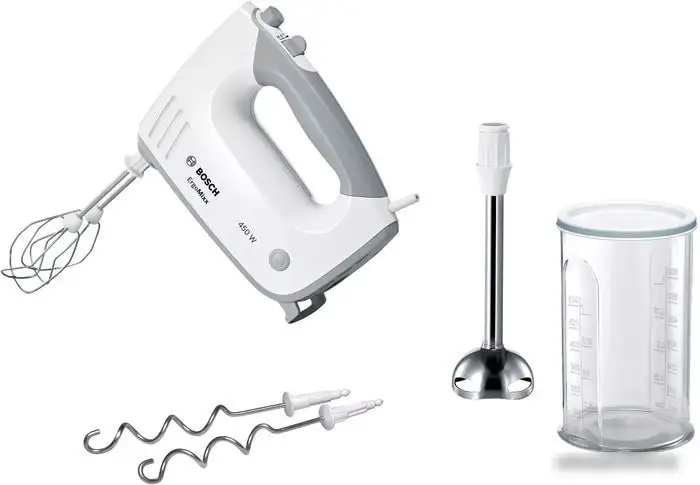 Миксер Bosch MFQ36470 — это удобный ручной прибор мощностью 450 Вт. Он имеет пять скоростей, что позволяет легко выбрать нужный режим для различных блюд. В миксере есть турборежим и импульсный режим, чтобы смесь была идеально однородной. Корпус сделан из прочного пластика, а кнопка отсоединения насадок делает использование ещё удобнее. В комплект входит мерный стакан на 0,6 литра с крышкой, а также насадки для взбивания теста, тестораскатки и блендер — всё, что нужно для домашней кухни.