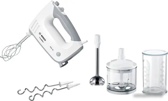 Миксер Bosch MFQ36480 — это легкий и удобный ручной прибор с мощностью 450 Вт, который хорошо справляется с разными задачами. У него есть пять скоростей и турборежим, что позволяет быстро выбрать нужный режим для любого продукта. Благодаря кнопке отсоединения насадок, процесс мытья и замены становится очень простым. В комплект входят универсальный измельчитель, насадка для теста, две насадки-венчики и блендер, что расширяет возможности использования. Миксер изготовлен из прочного пластика и не имеет весов, что делает его максимально удобным. Его компактный размер и надежность позволяют быстро и комфортно приготовить тесто, пюре или взбить сливки. Он идеально подходит для домашнего использования и экономит ваше время.