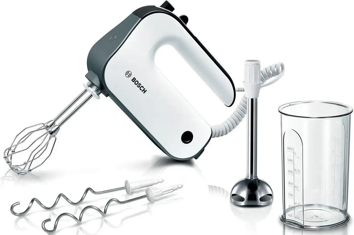 Миксер Bosch MFQ49700 — это ручное устройство с мощностью 850 Вт, которое быстро справляется с разными задачами. Он работает от сети и имеет пять скоростей для точного контроля процесса смешивания. В миксере есть турборежим, который ускоряет работу при необходимости. Устройство украшено белым и черным цветом и сделано из прочного пластика. Оно легко управляется благодаря кнопке отсоединения насадок. Длина сетевого шнура — 1,4 м, что дает больше свободы при использовании. В комплекте есть удобный мерный стакан и насадки: для теста, венчики и блендер. Насадки легко снимаются, что упрощает чистку и смену. Миксер отлично подходит для приготовления теста, пюре и взбивания. Он поможет вам быстро и удобно готовить домашние блюда.