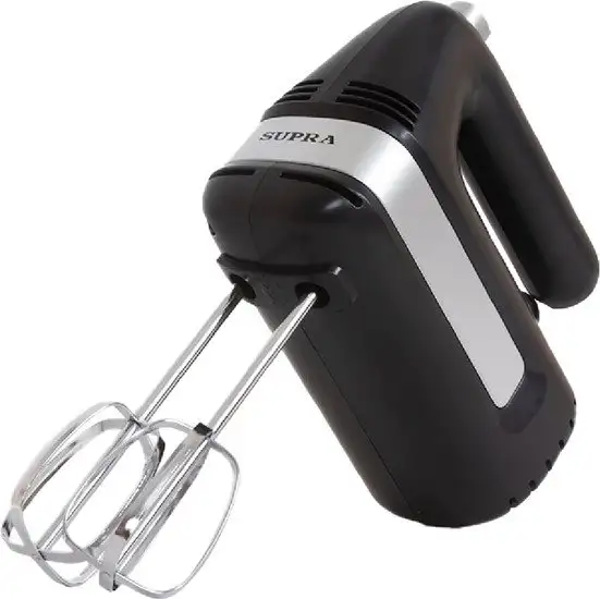 Миксер Supra MXS-596 — это ручное устройство, которое работает от электросети и имеет мощность 450 Вт. Он предлагает 5 скоростей, чтобы легко подобрать нужный режим для distintas задач. В корпусе из пластика расположены кнопки для быстрого отсоединения насадок и смены их. В комплект входят две насадки-венчика, которые позволяют взбивать сливки, яйца и тесто. Также есть насадка для теста, которая помогает замешивать тесто быстро и равномерно. Миксер не оснащён турборежимом и импульсным режимом, что делает его более простым в использовании. Он имеет классический чёрный цвет и компактный дизайн, удобный для хранения. Модель не включает измельчитель, мерный стакан или блендер, однако обеспечивает хорошую функциональность для домашнего использования.