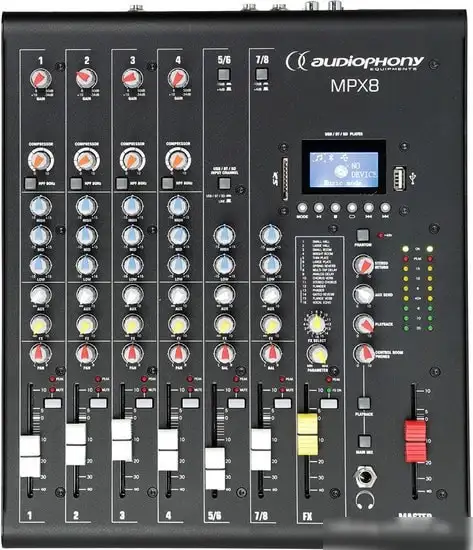 Микшерный пульт Audiophony MPX8 — это простое в использовании устройство для концертов и мероприятий. Он оснащён 8 каналами, среди которых есть микрофонные входы с разъёмами XLR и линейные входы, а также стерео входы для подключения различных устройств. Пульт позволяет управлять звуком с помощью фейдеров и встроенных эффектов, таких как реверб и дилэй, чтобы получить качественный звук. На устройство можно подключать наушники для контроля, а также оно поддерживает воспроизведение музыки с USB-накопителей и SD-карт. Встроенный дисплей показывает важную информацию, а светодиоды помогают отслеживать сигналы и уровень громкости. Благодаря фантомному питанию 48 В, пульт удобно использовать с микрофонами и другими профессиональными устройствами. Устройство удобно транспортировать, ведь его размеры позволяют легко его разместить и подключить к необходимому оборудованию.