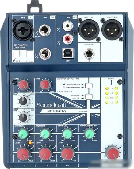 Микшерный пульт Soundcraft Notepad 5 предназначен для студийных задач и легко подходит для работы с разными источниками звука. Он оснащён 5 каналами, включая микрофонный вход с возможностью фантомного питания и линейные входы с разными типами разъёмов. Управление громкостью осуществляется с помощью ручных потенциометров, а есть встроенные эквалайзеры для настройки звука. Этот пульт подключается к компьютеру через USB, что удобно для записи и обработки звука. Он не имеет встроенного усилителя, зато позволяет подключать наушники и выводить звук на мониторы через выходы. Компактный и лёгкий – его легко брать с собой и использовать в разных условиях.
