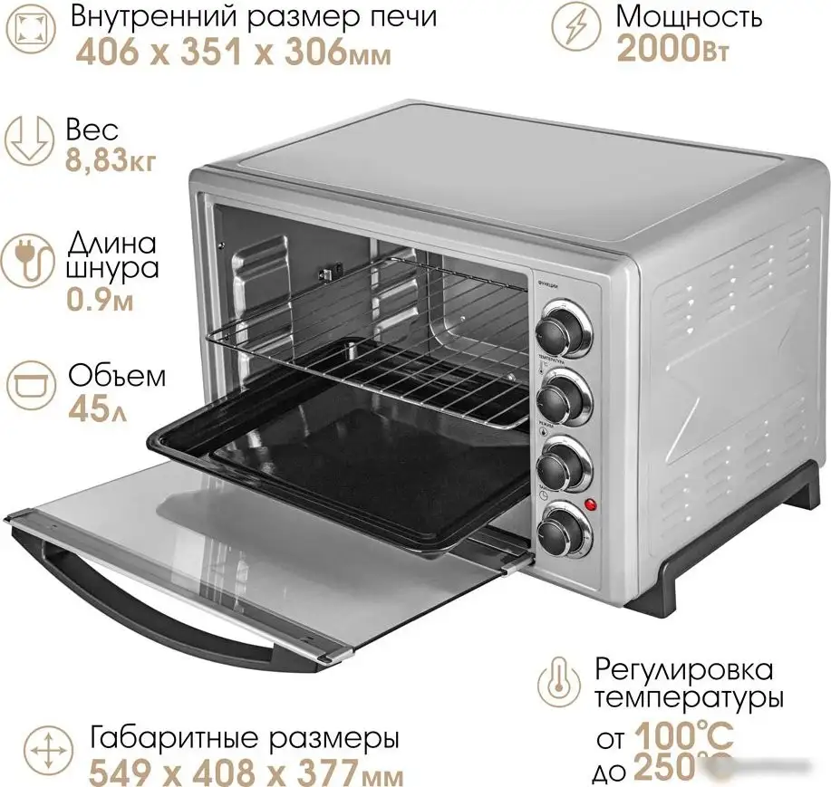 электрический, мощность духовки 2000 Вт, 45 л, конвекция, вертел