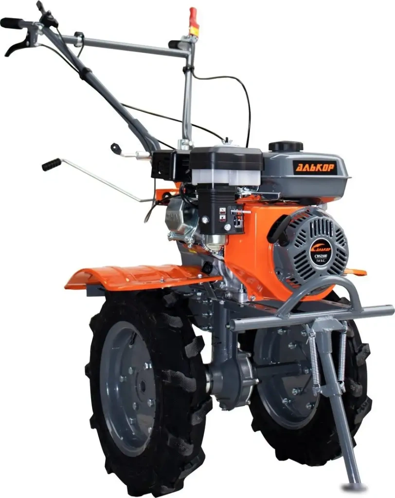 Мотоблок бензиновый Алькор МБ8-10 работает на 7 лошадиных сил и легко выполняет работы по обработке земли. Он имеет ширину захвата 100 см, что позволяет быстро обрабатывать большие участки. Мотоблок оснащен четырёхтактным двигателем внутреннего сгорания и тремя передачами — двумя вперёд и одной назад, что обеспечивает удобную работу. Благодаря ручному пуску и регулируемому по высоте рулю, управление становится более комфортным. Комплектация включает надувные колёса размером 4.00-10 для стабильной работы на разной поверхности. Также предусмотрена возможность установки навесного оборудования для расширения функций устройства. Надежный двигатель и простое управление делают мотоблок универсальным помощником для фермеров и дачников. Каркас и габариты позволяют легко транспортировать и хранить его. Мотоблок пригоден для различных задач и отличается хорошей мощностью и удобством в использовании.