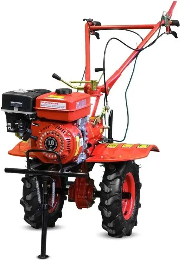 Мотоблок Хопер 1000У-3 7Б — это мощный бензиновый инструмент, который легко справляется с земляными работами. Его двигатель мощностью 7 л.с. обеспечивает хорошую производительность, а ширина захвата в 70 см позволяет быстро обрабатывать большие участки. Глубина вспашки достигает 15 см, что помогает качественно подготовить землю. Мотоблок имеет три передачи — одну назад и две вперед, что облегчает управление. Его руль регулируется по высоте, чтобы было удобно работать. Можно установить дополнительное навесное оборудование, например, фрезы. В комплект входят фрезы, что позволяет сразу приступать к работе. Это делает мотоблок удобным и универсальным помощником в саду или на огороде.