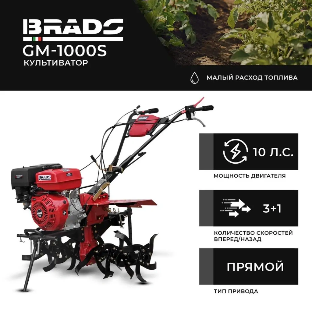 - Мощный бензиновый двигатель — обеспечивает стабильную работу на больших участках.