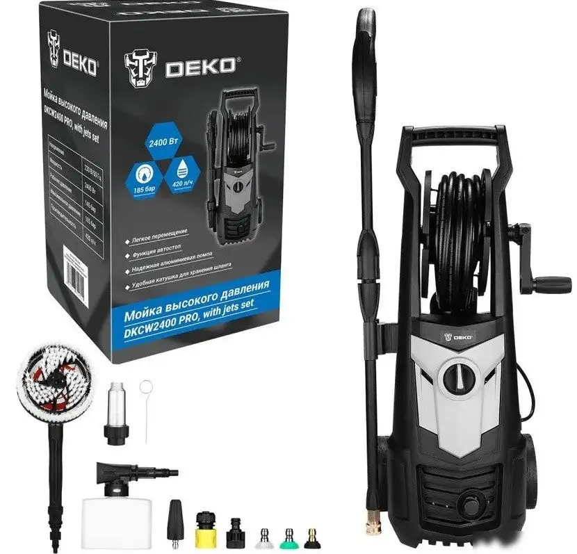 Мойка высокого давления Deko DKCW2400 PRO мощностью 2 400 Вт работает от электросети и обеспечивает производительность 420 литров воды в час. Она создаёт давление до 185 бар, что позволяет легко очищать поверхности, удаляя грязь и налёт. Встроенная подача моющего средства помогает экономить время и достигать лучших результатов. Корпус насоса сделан из алюминия, что обеспечивает долговечность и устойчивость к коррозии. Мойка не имеет бака для воды, а длина шланга составляет 10 метров, что удобно для обработки больших площадей. В комплект входят насадки: грязевая фреза, щётка, веерная насадка и распылитель, что делает работу более эффективной. Устройство оснащено четырьмя колесами для лёгкого перемещения и блоком для хранения шланга. Внутри есть держатель для шланга, пистолетов и моющего средства, что способствует порядку при использовании. Высокая мощность и широкий набор аксессуаров позволяют быстро и удобно выполнить уборку как дома, так и на улице.