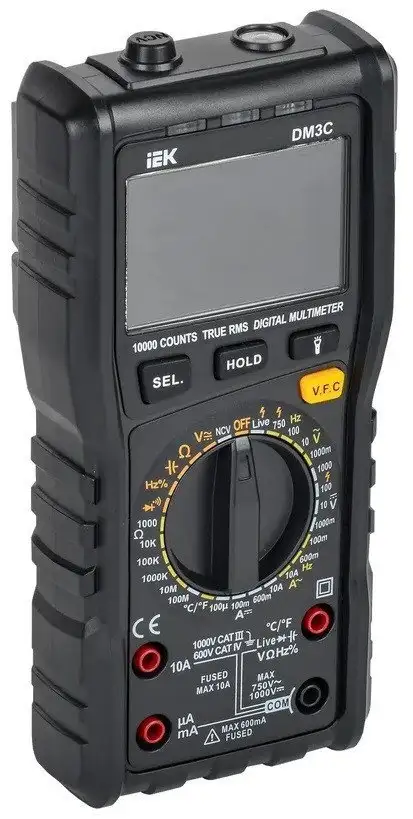 Мультиметр IEK ARMA2L 5 DM3C — это устройство для измерения различных электрических параметров, таких как напряжение, ток, сопротивление и емкость. Он способен измерять постоянное и переменное напряжение до 999 В и до 10 А тока, а также сопротивление до 99 МОм. В мультиметре есть функции проверки диодов и прозвонки, что помогает быстро определить неисправности в электросхемах. Он оснащён подсветкой дисплея для удобства использования в темных местах и автоматическим отключением, чтобы сэкономить батарею. В комплект входят измерительные щупы и удобный футляр для хранения, а батарейка типа AA питает его работу. Благодаря компактным размерам и лёгкому весу — всего 350 г — этот мультиметр удобно брать с собой.